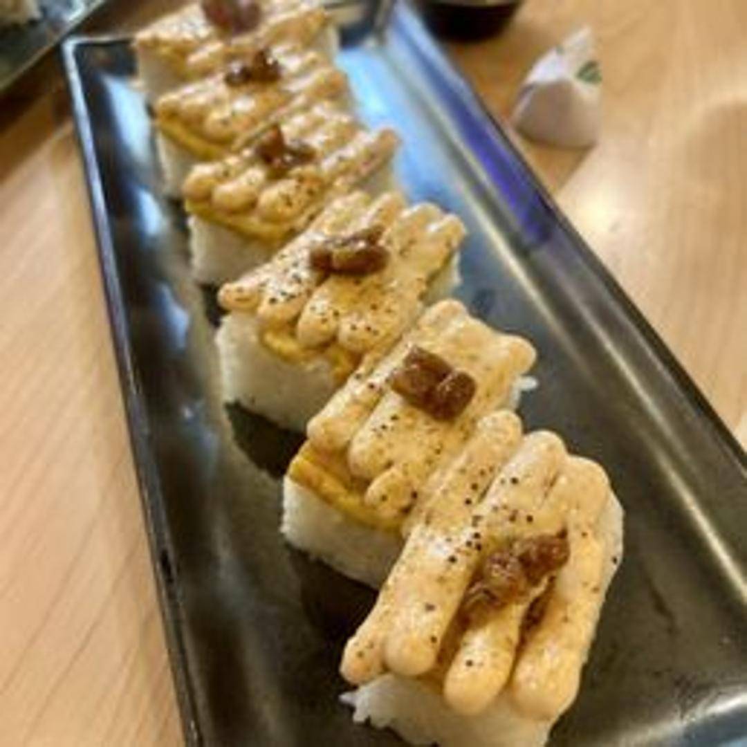 Pressed sushi featuring fermented soy beans (natto) and sweet Japanese omelet (tamago) layered on top of seasoned sushi rice.