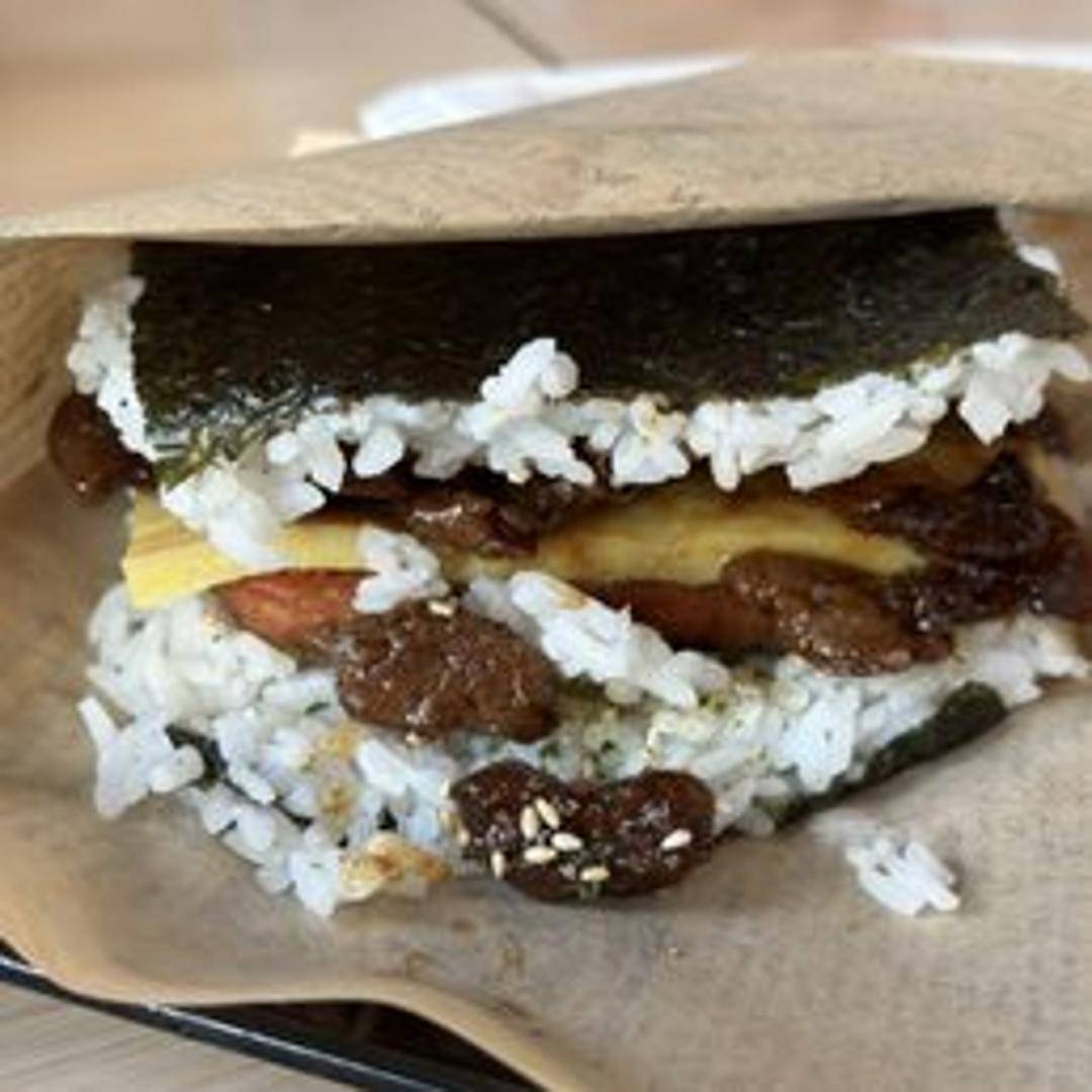 A flavorful rice ball filled with tender teriyaki-glazed beef and wrapped in nori seaweed.