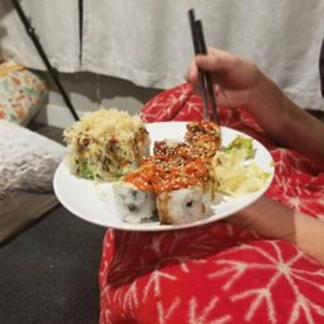A unique roll filled with crispy kakiage (vegetable tempura fritters), avocado, and a drizzle of sweet sauce.