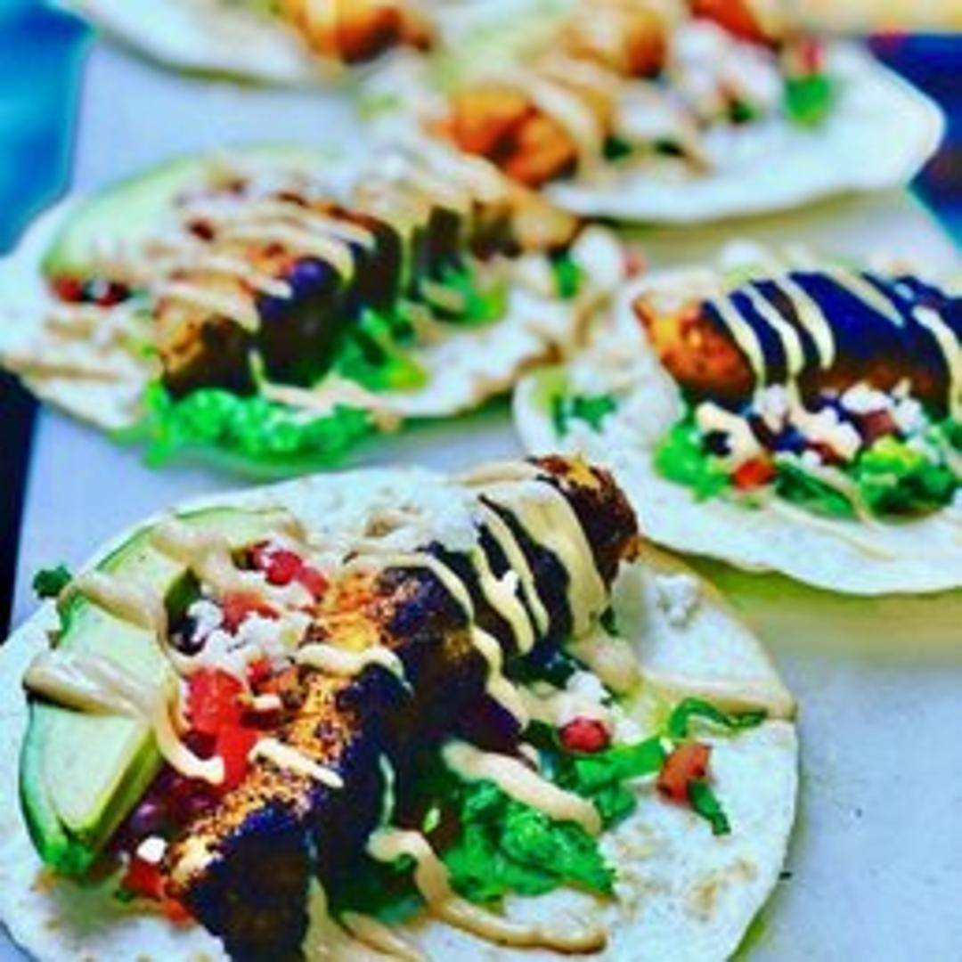Two soft tacos filled with grilled or fried white fish, shredded cabbage, pico de gallo, and a creamy chipotle sauce. Served with a side of lime wedges.