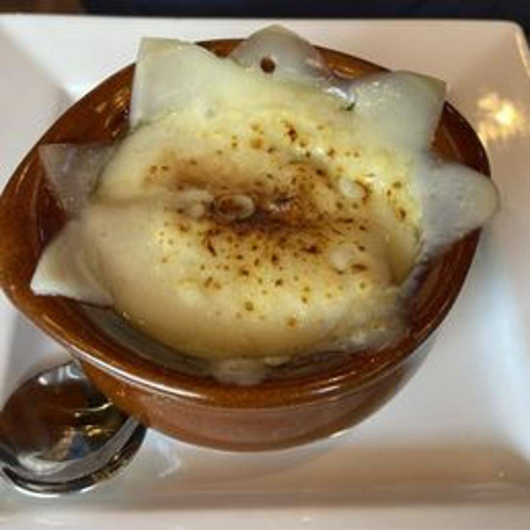Classic French onion soup, featuring caramelized onions simmered in a rich beef broth, topped with a toasted crouton and melted Gruyere cheese.