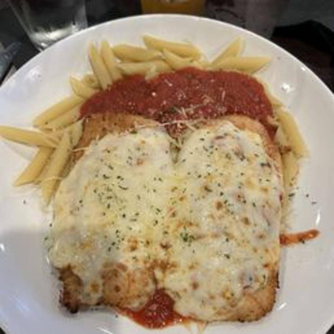 Breaded and pan-fried chicken breast topped with marinara sauce and melted mozzarella cheese. Served with a side of spaghetti.