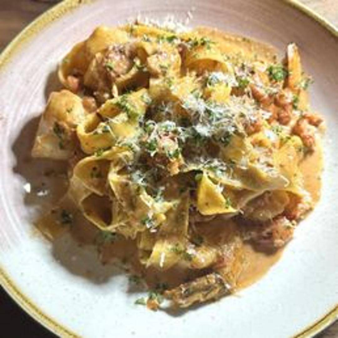 Wide, flat pappardelle pasta tossed with a medley of fresh seafood, including [insert likely seafood contents - e.g., shrimp, mussels, clams, calamari], simmered in a [insert sauce type - e.g., light tomato sauce, creamy garlic sauce, or white wine sauce].