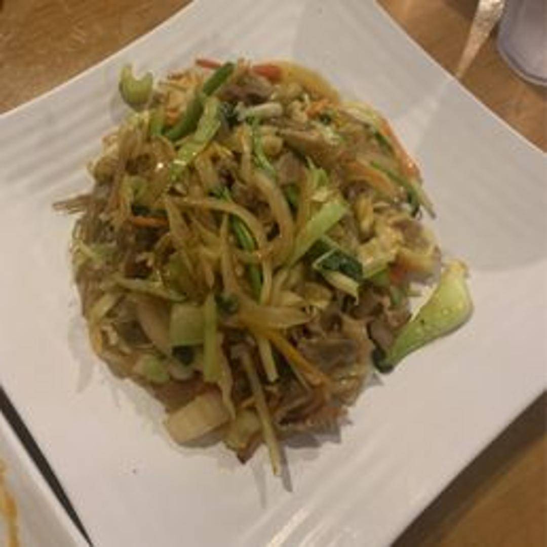 Glass noodles stir-fried with thinly sliced vegetables (such as carrots, onions, spinach, and mushrooms) and beef (optional) in a savory sesame oil-based sauce.