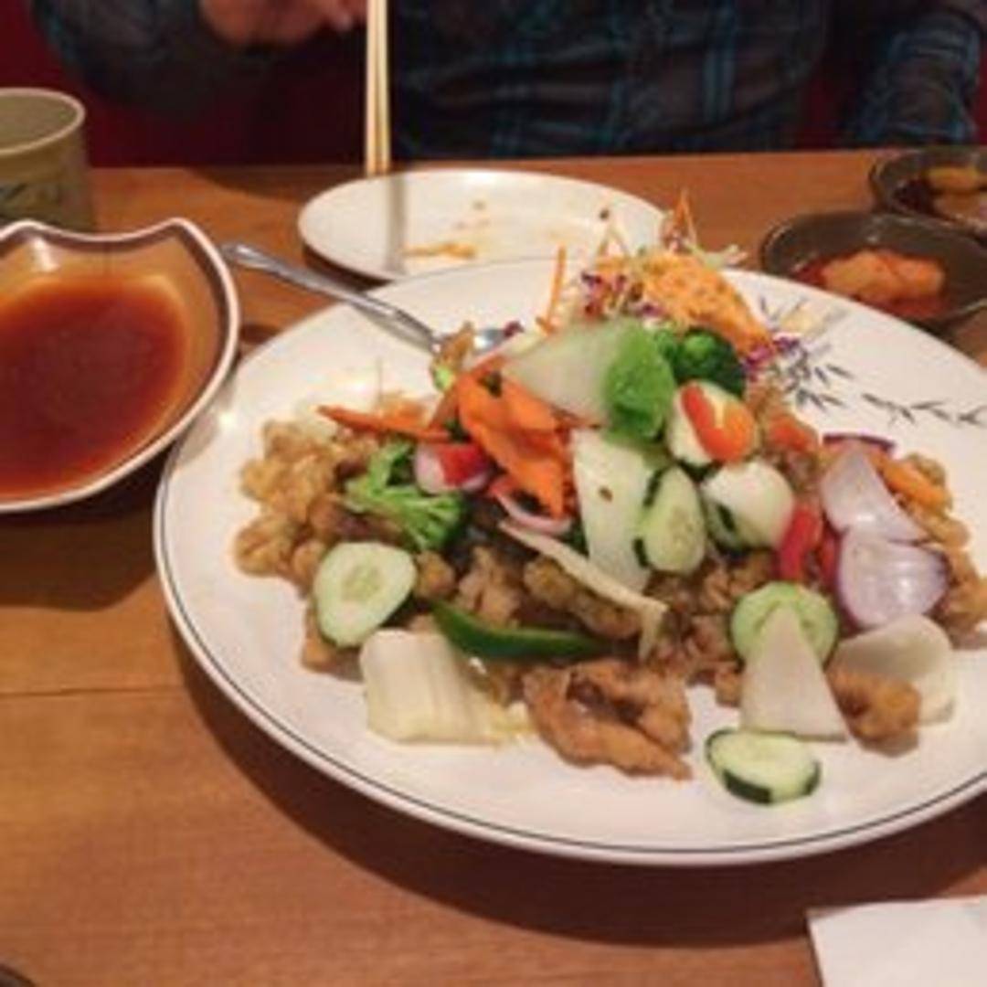 Crispy fried pork pieces coated in a tangy and sweet sauce made with vinegar, sugar, and various vegetables. Served with a side of dipping sauce.