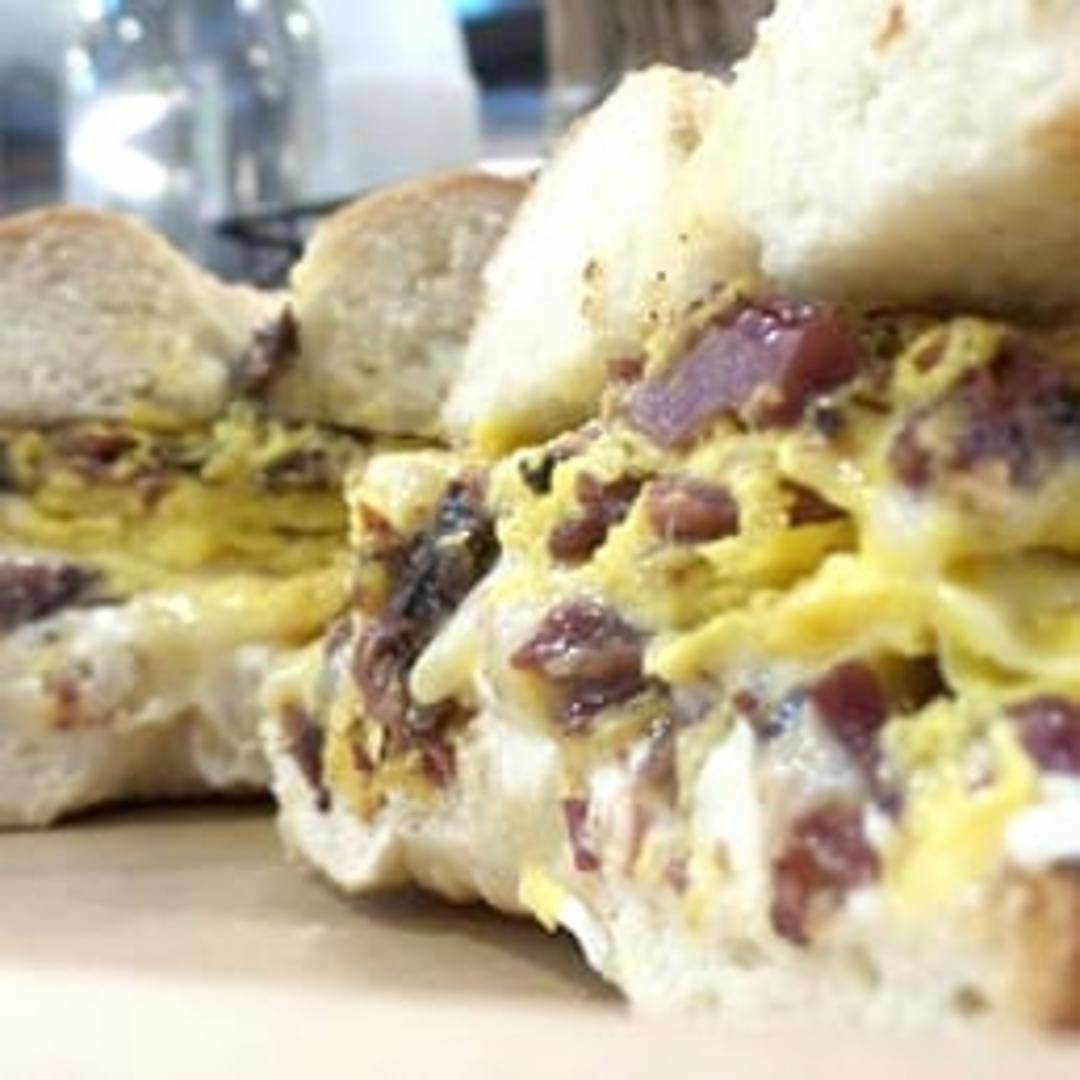 A freshly baked bagel topped with fluffy scrambled eggs and melted cheese. A hearty and comforting breakfast or brunch option.