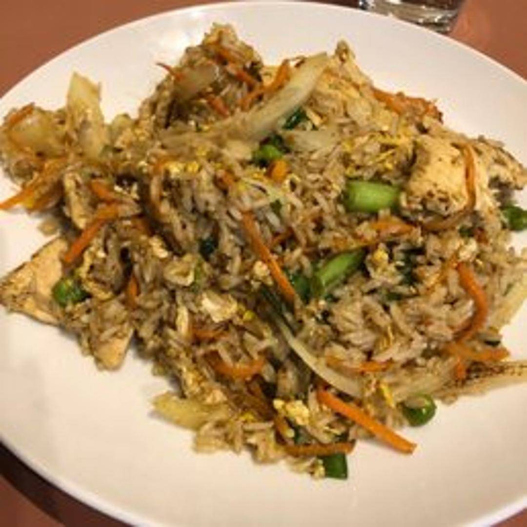 Delicious jasmine rice stir-fried with pineapple chunks, cashew nuts, raisins, onions, carrots, peas, egg, and your choice of protein (chicken, pork, beef, tofu, or shrimp), seasoned with a light curry powder.