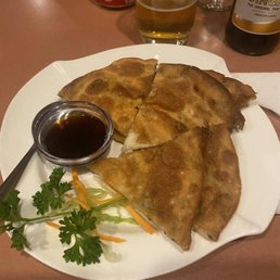 Crispy, savory pancakes made with layers of flaky dough and chopped scallions. Served with a side of dipping sauce.