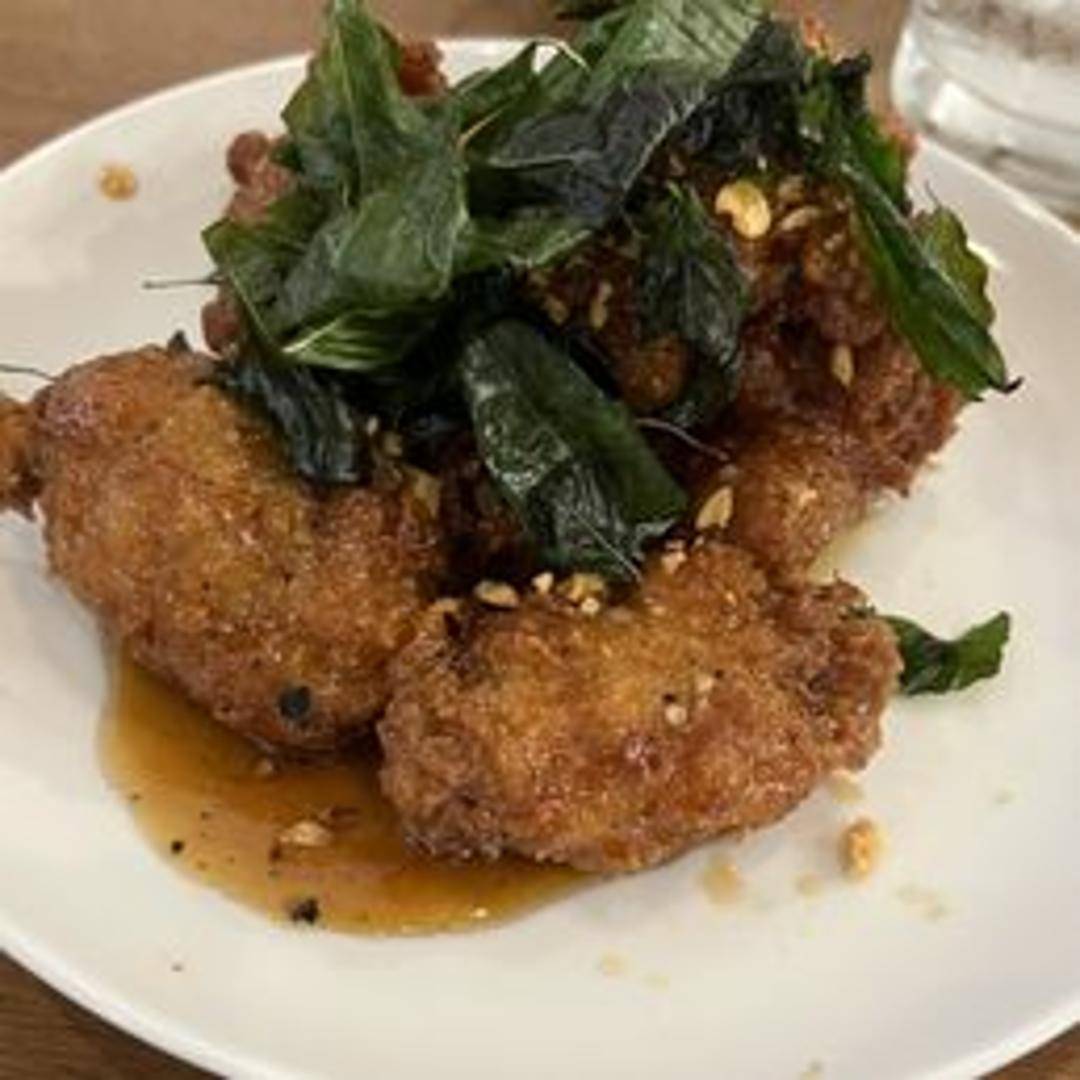 Crispy fried chicken wings tossed in a sweet and savory basil sauce with garlic, chili, and fresh basil leaves.