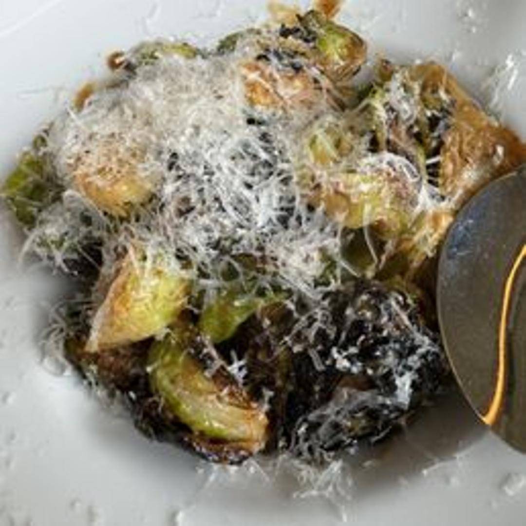 Crispy Brussels sprouts, pancetta, balsamic glaze, mozzarella, parmesan.