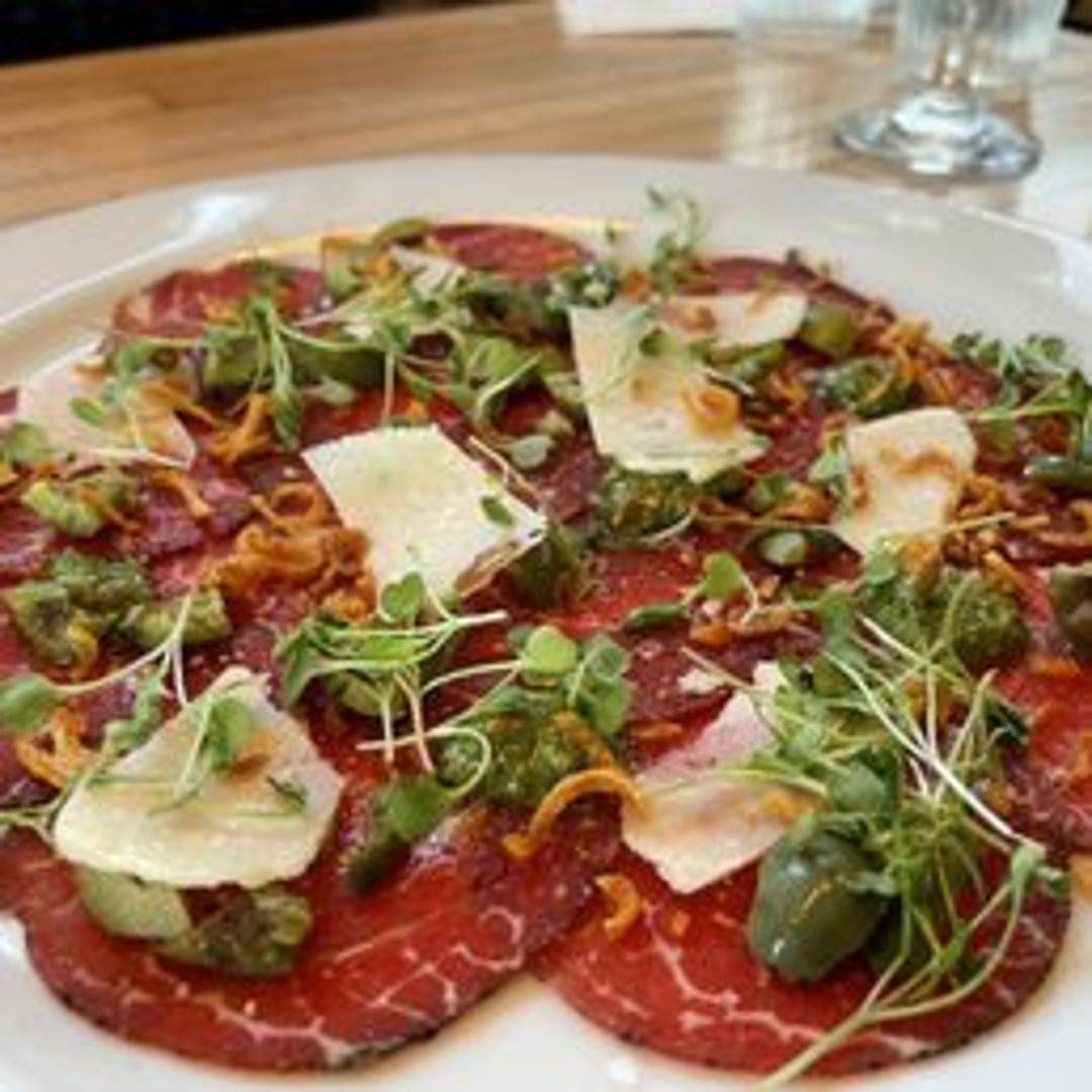 Thinly sliced raw beef, arugula, shaved parmesan, lemon vinaigrette, capers.