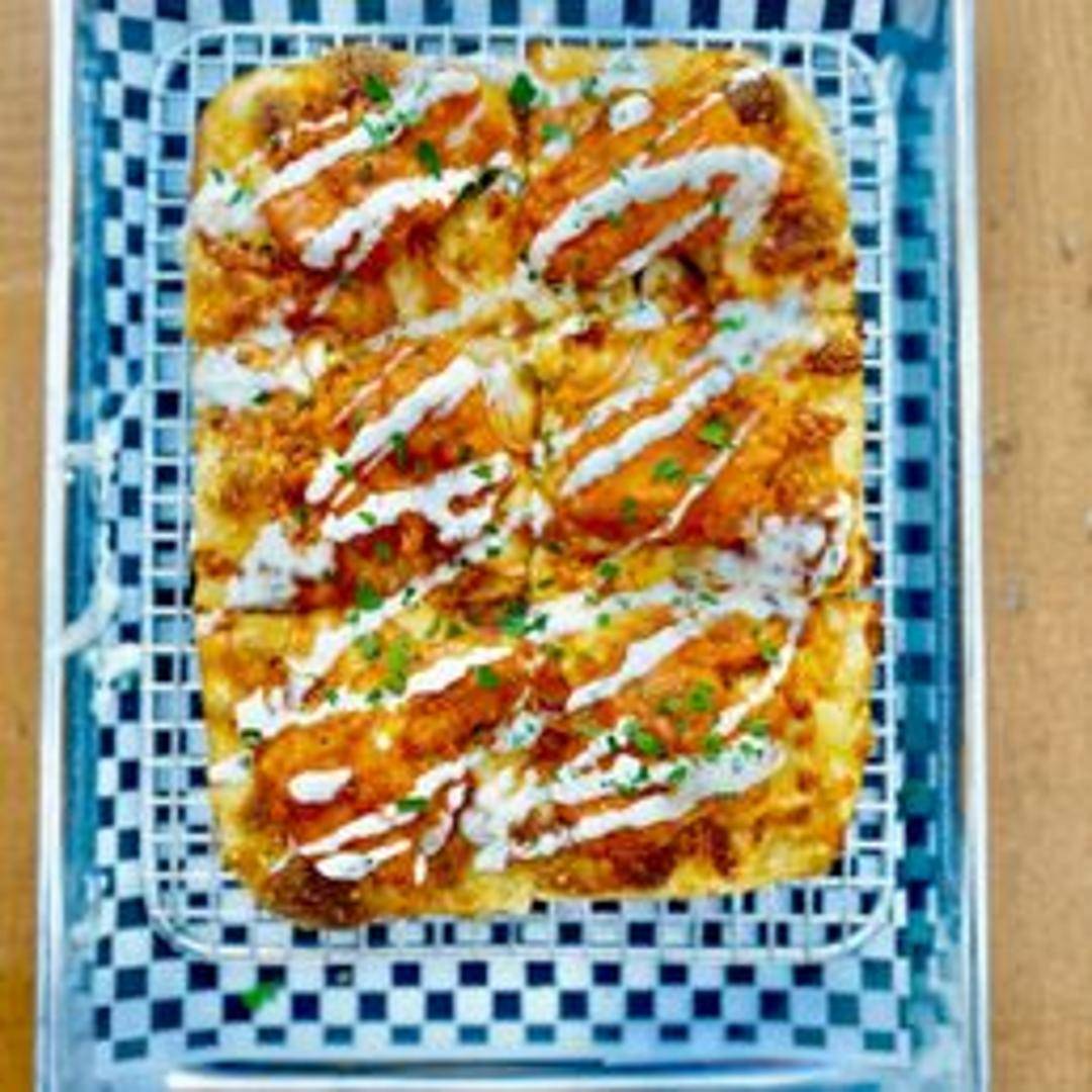 Grilled chicken, buffalo sauce, gorgonzola, mozzarella, celery, ranch drizzle.