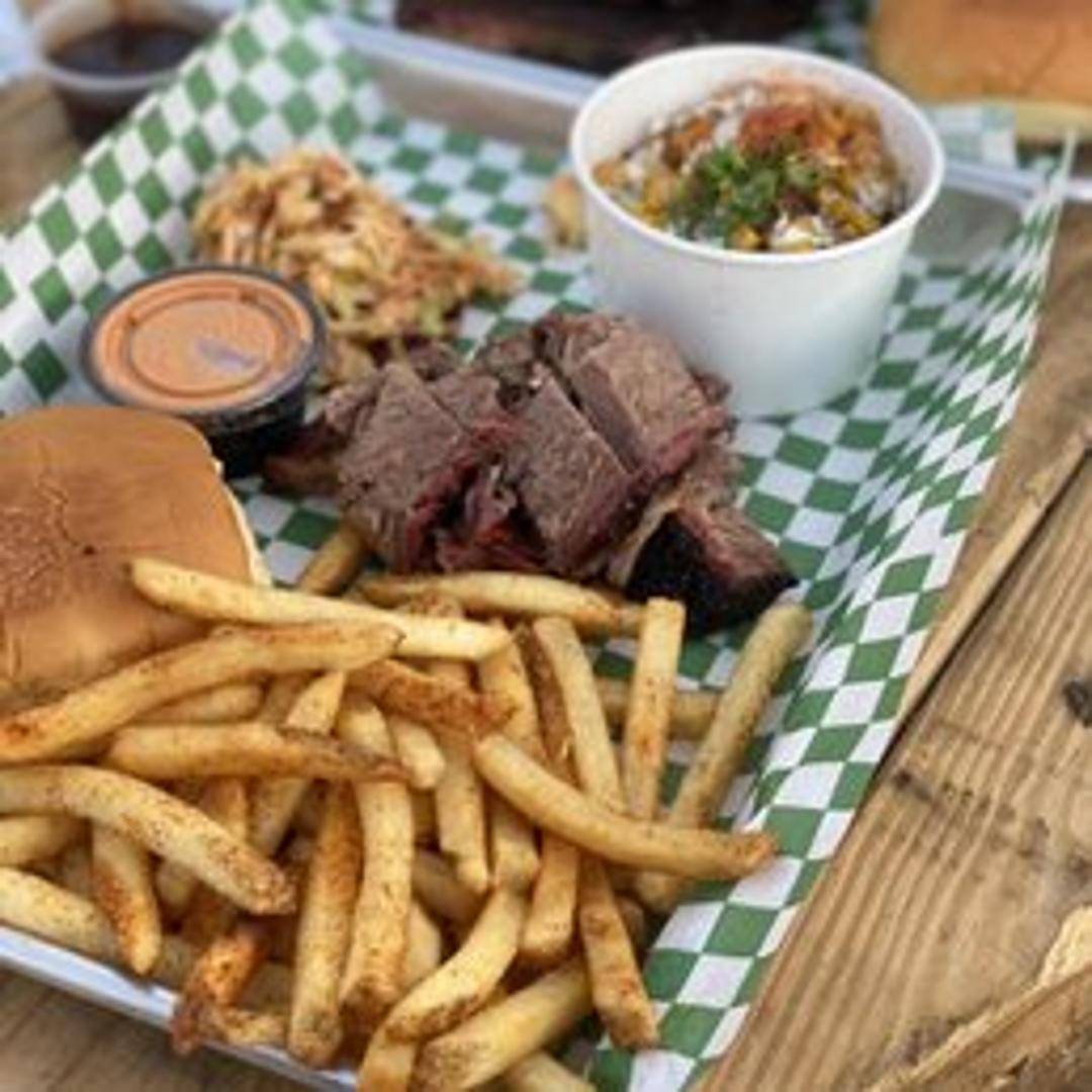 Slow-smoked brisket, sliced and served with your choice of two sides and bread.