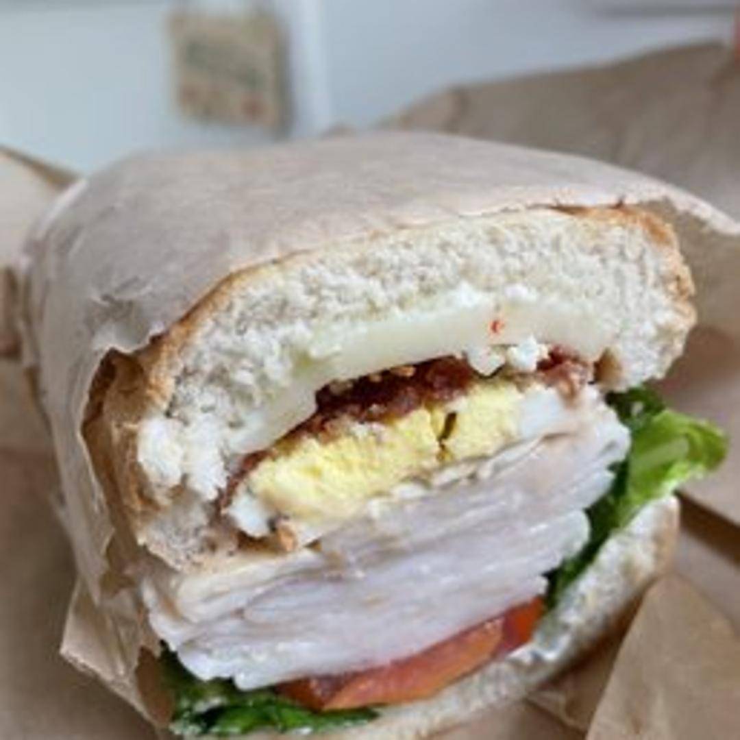 Stacked high with sliced turkey, ham, bacon, lettuce, tomato, and mayonnaise on toasted bread. Served with a pickle spear.
