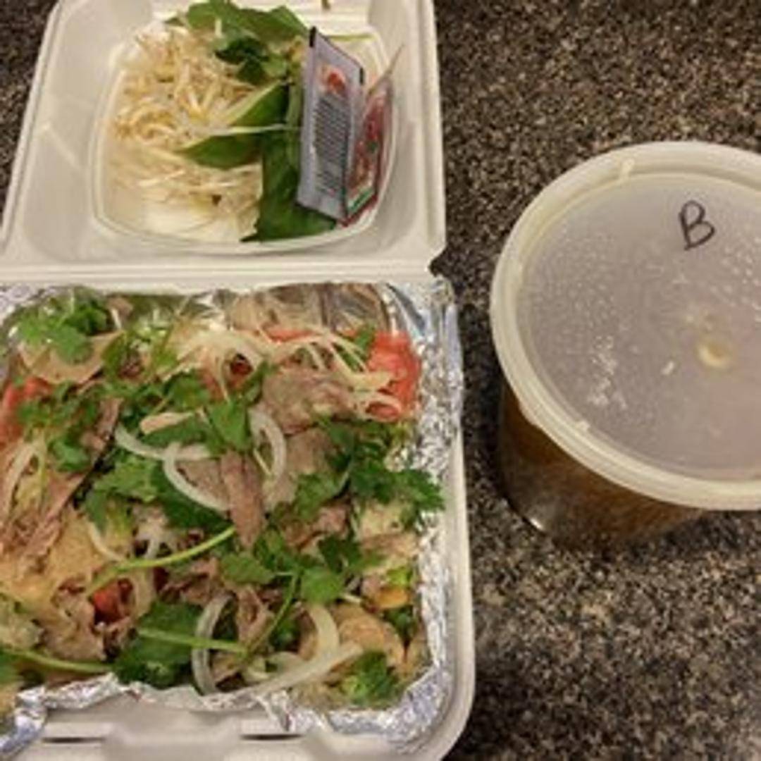 A large bowl of traditional Vietnamese noodle soup featuring a rich and flavorful broth, rice noodles, and a combination of sliced beef, meatballs, and tendon. Garnished with fresh herbs, bean sprouts, lime, and jalapenos.