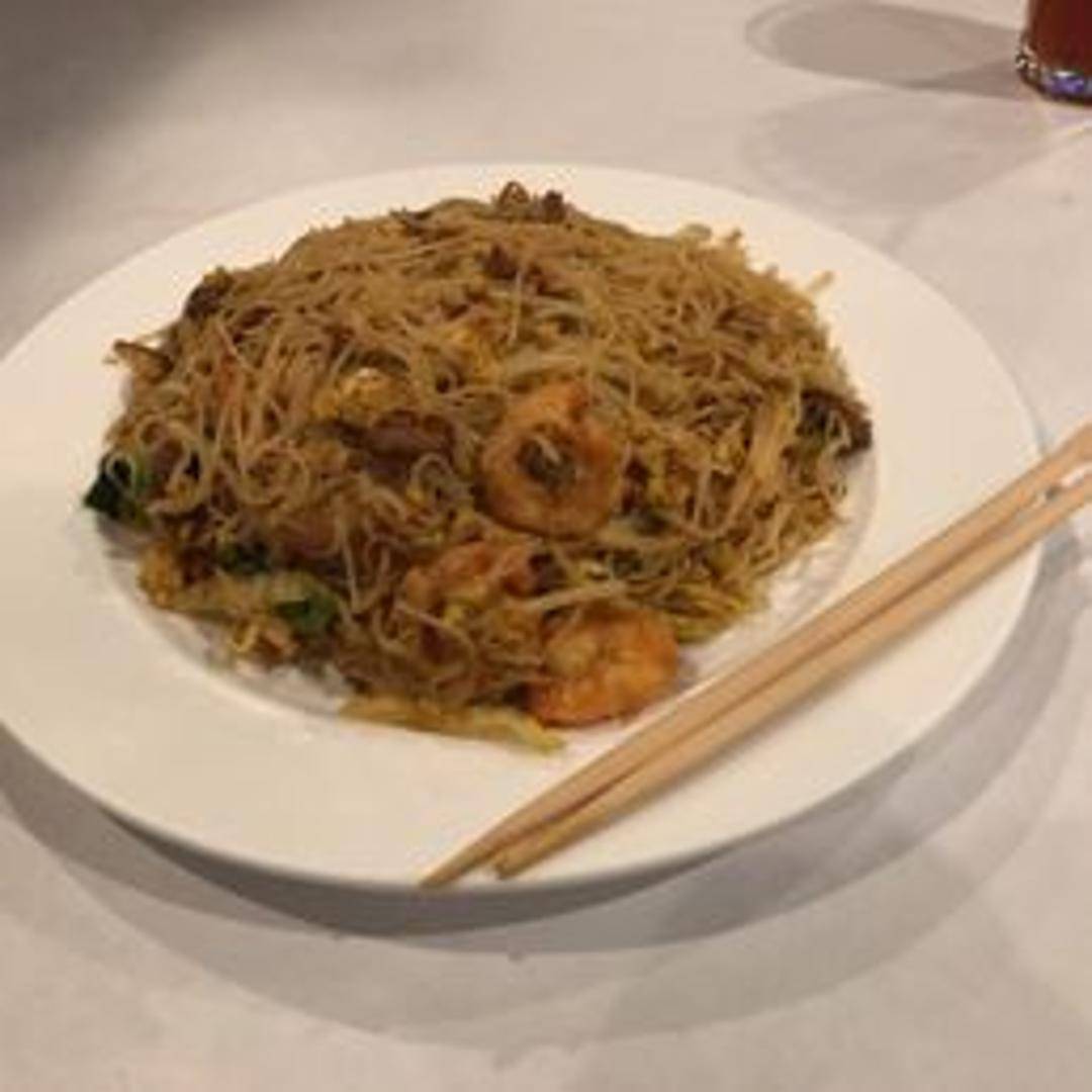 A classic and aromatic stir-fried dish featuring thin rice vermicelli noodles. Infused with a vibrant yellow curry powder, this flavorful noodle dish typically includes a medley of succulent chicken, tender shrimp, and savory BBQ pork, alongside crisp vegetables such as bell peppers, onions, and bean sprouts, often scrambled with egg. This satisfying and fragrant offering delivers a perfect balance of textures and a delightful, mildly spicy kick.