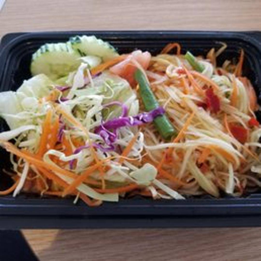 A refreshing and spicy salad made with shredded green papaya, tomatoes, green beans, peanuts, garlic, chili peppers, fish sauce, and lime juice. A classic Thai dish known for its vibrant flavors.