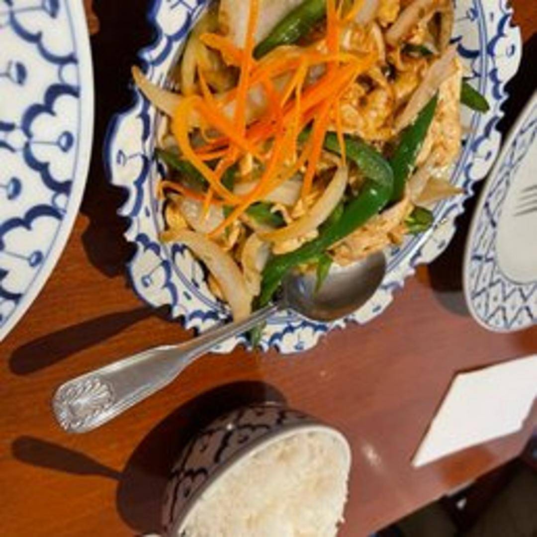 Wide rice noodles stir-fried with your choice of protein (chicken, pork, beef, tofu, or shrimp), chili peppers, garlic, onions, bell peppers, tomatoes, and basil leaves in a savory and spicy sauce.