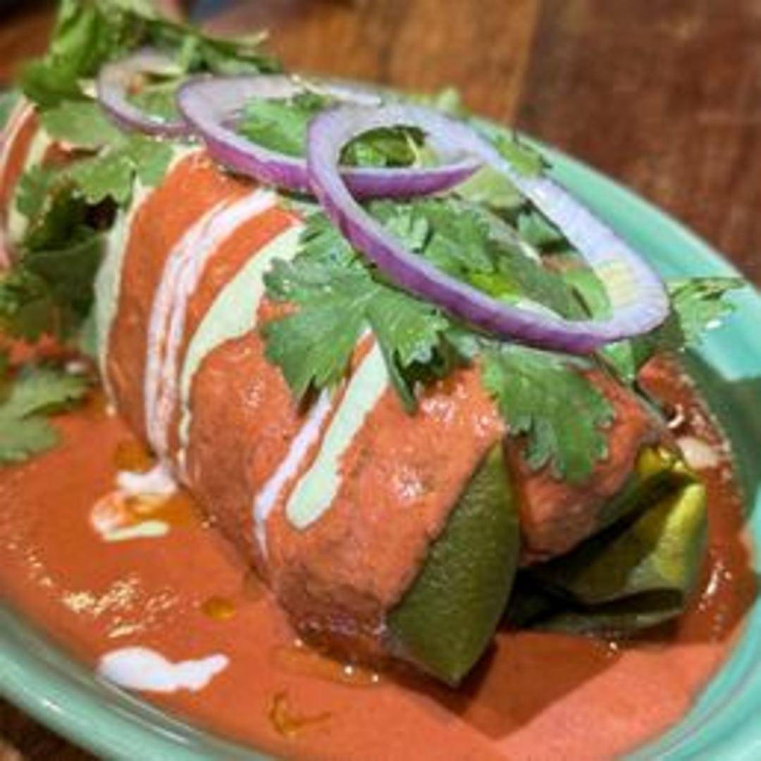 A plant-based twist on a classic favorite. Roasted poblano pepper stuffed with a creamy cashew cheese filling, wrapped in a warm tortilla with rice, beans, and your choice of toppings. A flavorful and hearty vegan burrito.