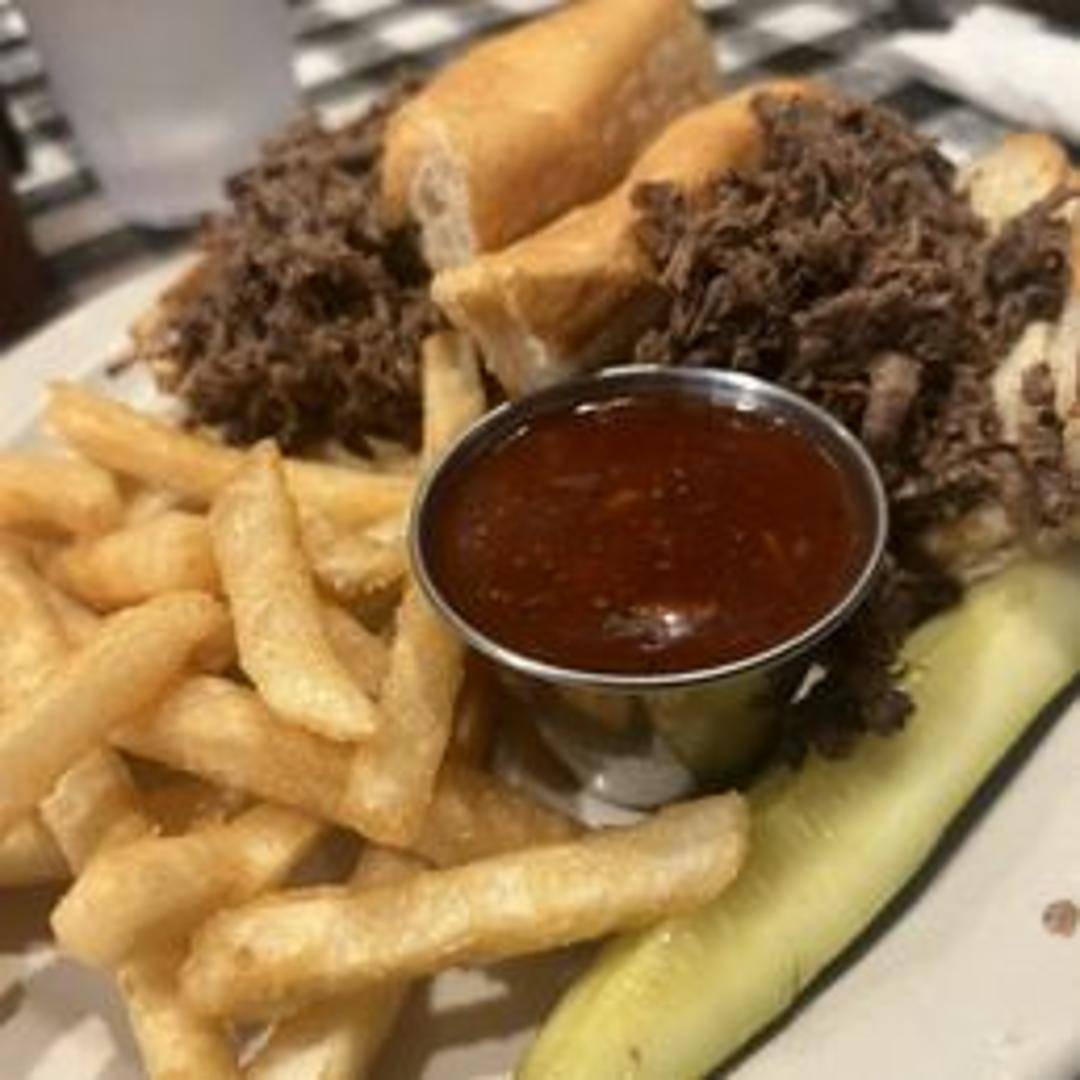 Tender, slow-cooked shredded beef piled high on a toasted bun. Served with your choice of BBQ sauce or au jus for dipping. A classic comfort food sandwich.