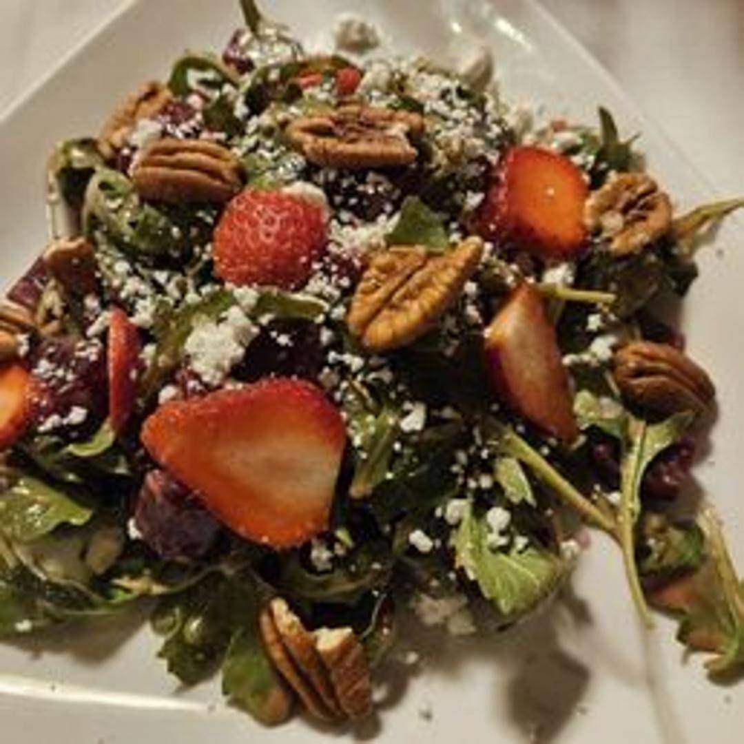 A vibrant salad featuring roasted beets, mixed greens, crumbled goat cheese, candied walnuts, and a light vinaigrette dressing.