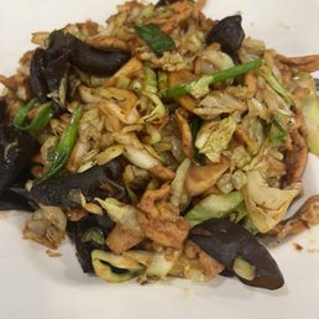 Stir-fried shredded pork with finely sliced cabbage, bamboo shoots, wood ear mushrooms, scallions, and scrambled eggs in a savory hoisin sauce. Served with thin, Mandarin pancakes for wrapping.