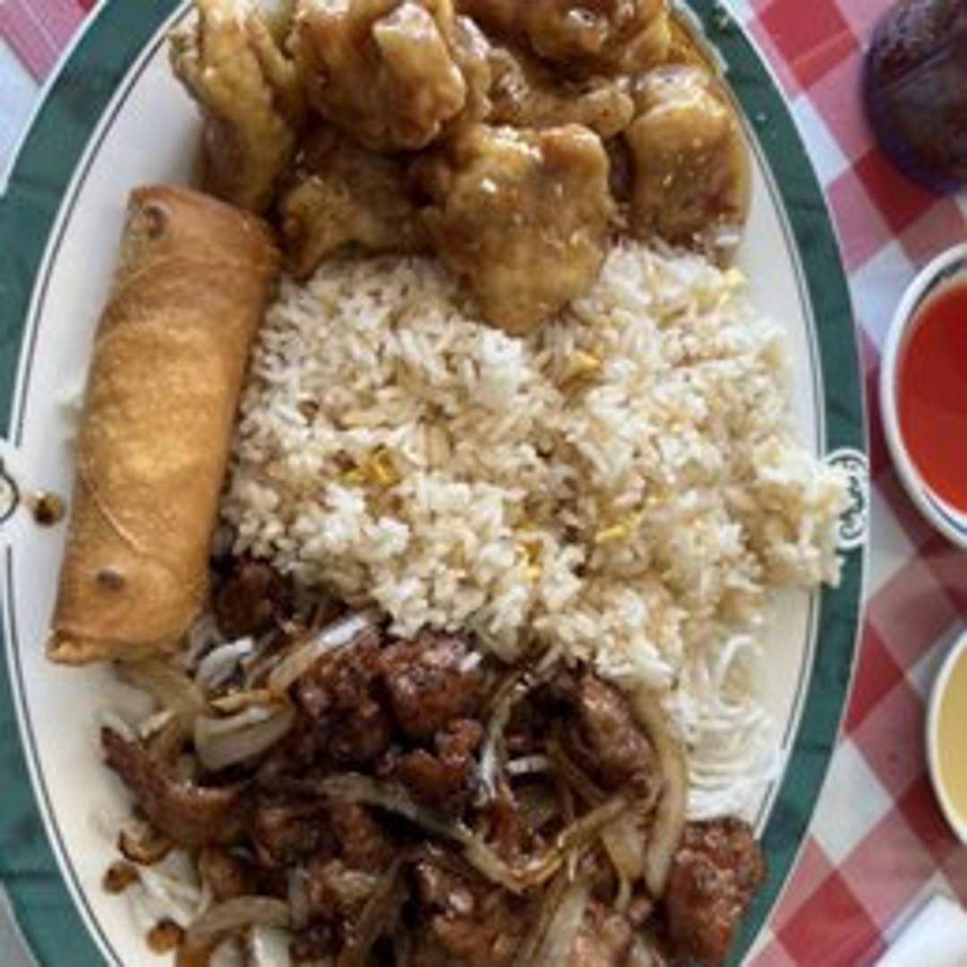 Crispy, battered chicken pieces coated in a sweet and savory sesame sauce. Sprinkled with sesame seeds. Served with a side of steamed rice.