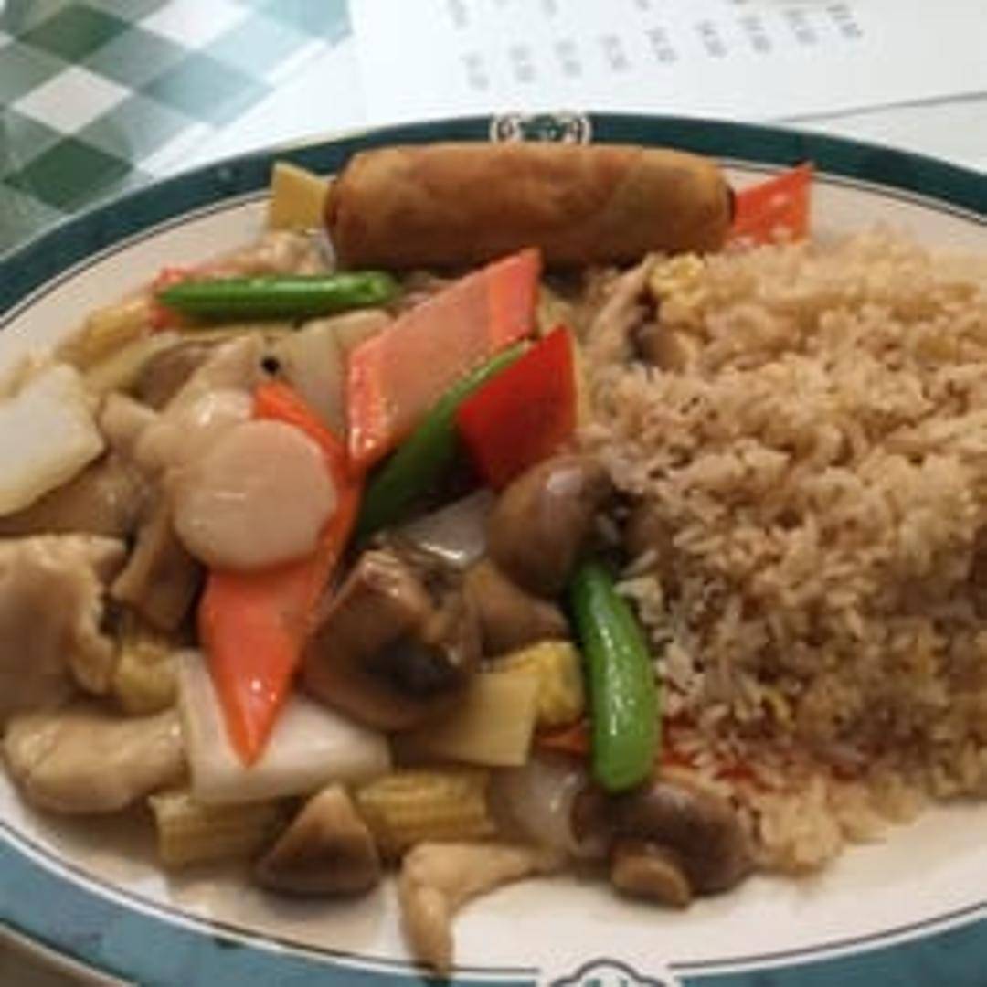 Sliced chicken stir-fried with mushrooms, bamboo shoots, water chestnuts, and snow peas in a light, savory white sauce.