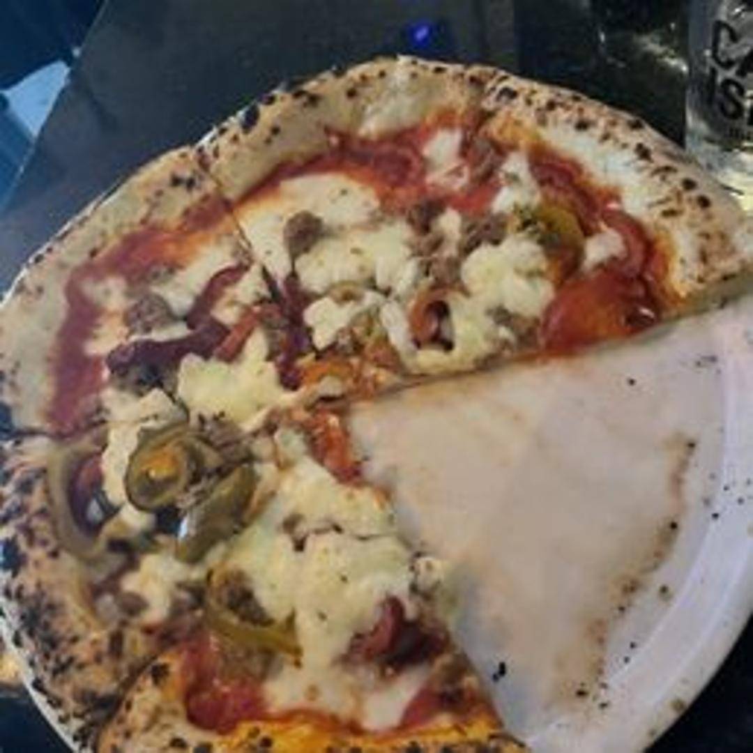 Pizza featuring a white garlic sauce base, topped with spinach, ricotta cheese, mozzarella cheese, and sliced tomatoes.