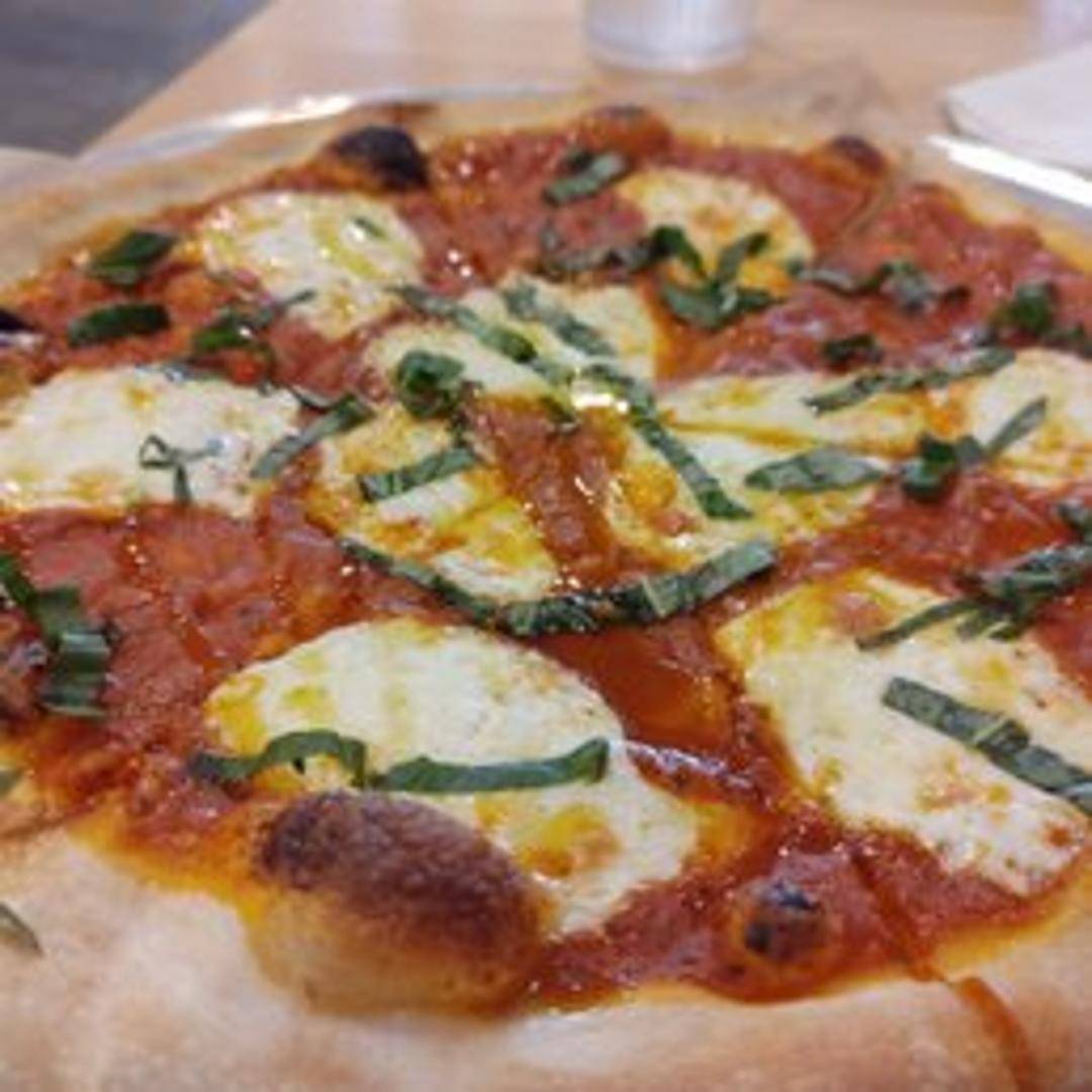 A traditional Neapolitan pizza topped with crushed tomatoes, fresh mozzarella, basil leaves, and a drizzle of olive oil on our signature wood-fired crust.