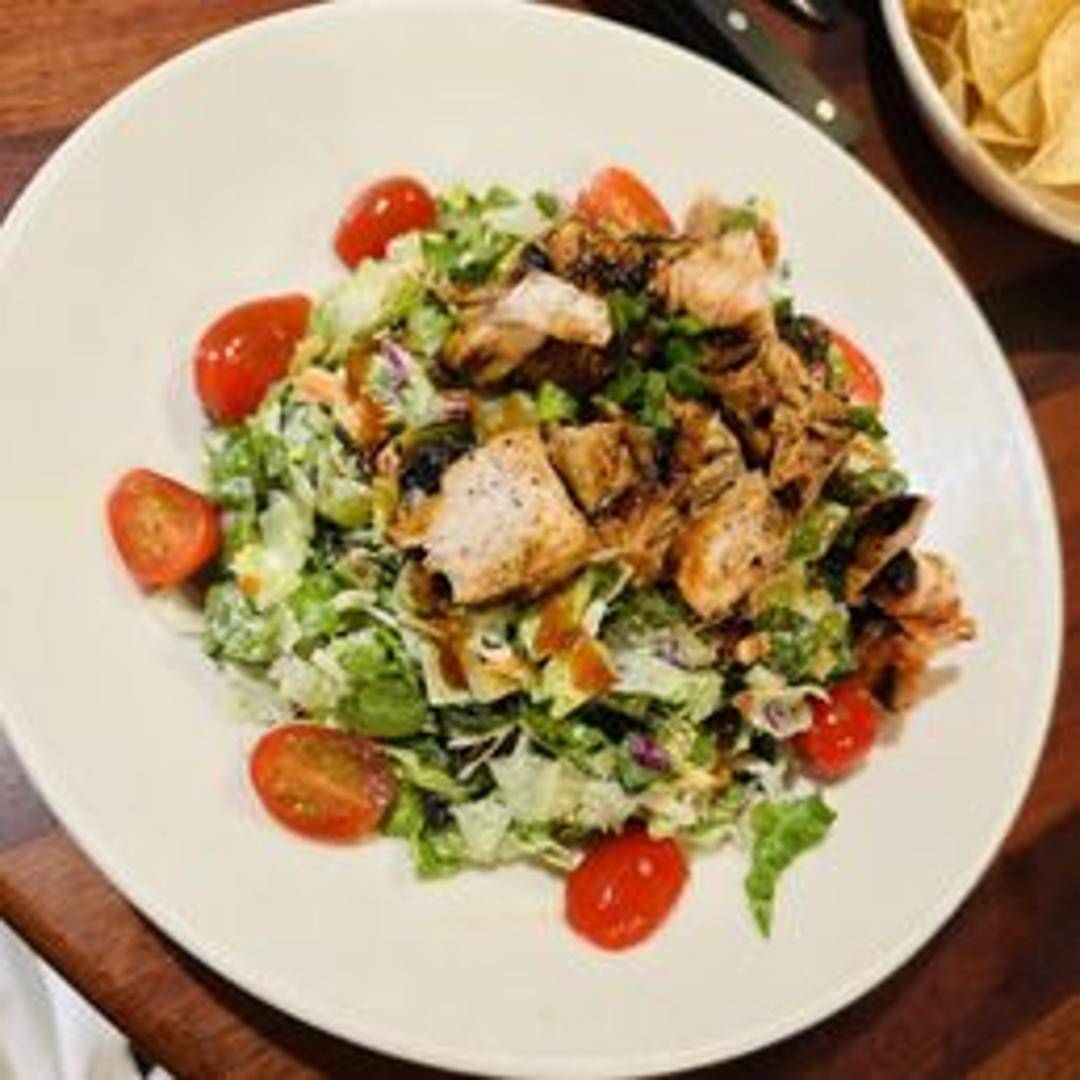 Chopped lettuce, grilled corn, black beans, tomatoes, red onion, cilantro, tortilla strips, and your choice of BBQ chicken or pulled pork, tossed in a creamy BBQ ranch dressing.