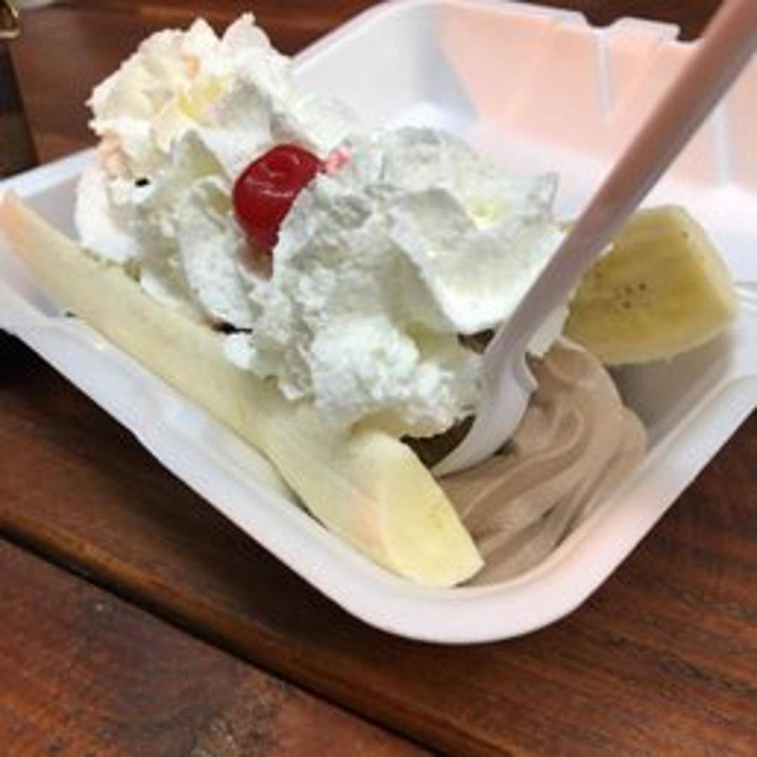 A classic dessert featuring a split banana topped with scoops of vanilla, chocolate, and strawberry ice cream. Drizzled with chocolate syrup, strawberry topping, and pineapple topping. Garnished with whipped cream, chopped nuts, and a maraschino cherry.