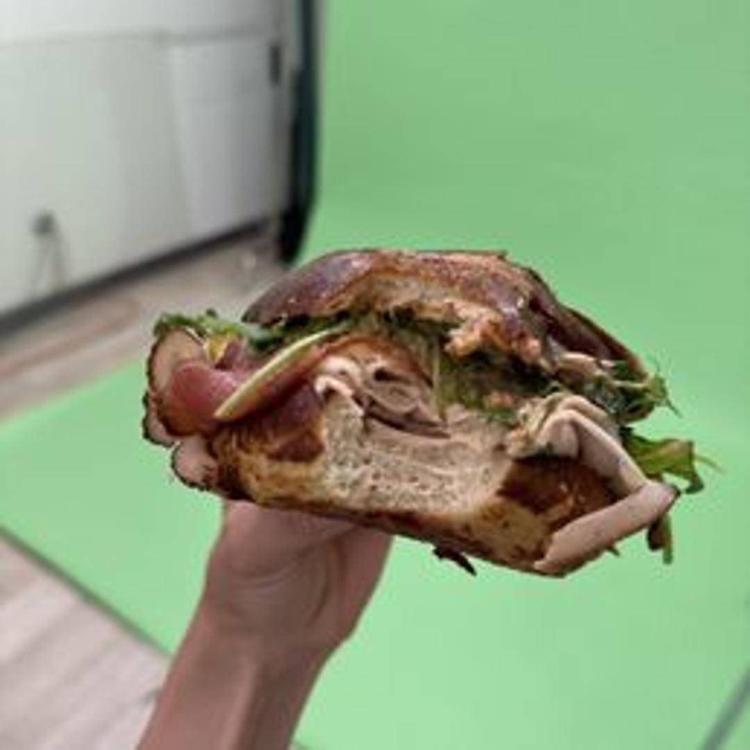 Sliced turkey breast, swiss cheese, lettuce, tomato, and honey mustard on a pretzel roll.