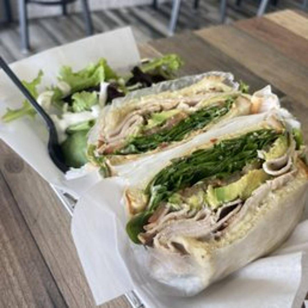 A warm and savory sandwich with sliced turkey, melted cheese (choice of Swiss, cheddar, or provolone), lettuce, tomato, and your choice of dressing on grilled bread.