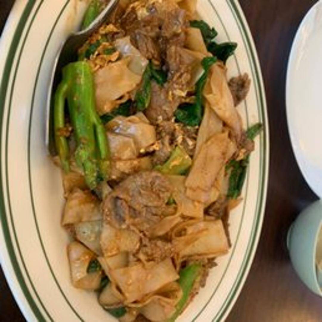 Wide rice noodles stir-fried in a sweet soy sauce with egg, Chinese broccoli, and your choice of protein (typically pork, chicken, or beef).