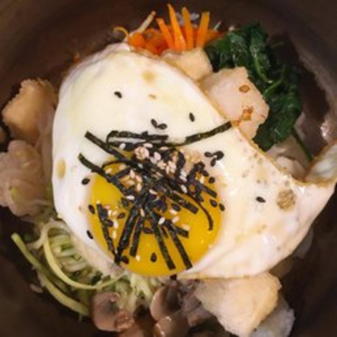 A vibrant and flavorful Korean rice bowl topped with a medley of sauteed and fresh vegetables, savory fried tofu, and a fried egg. Served with a side of gochujang (Korean chili paste) to customize the spice level. Includes seasoned rice, carrots, spinach, bean sprouts, mushrooms, and zucchini.