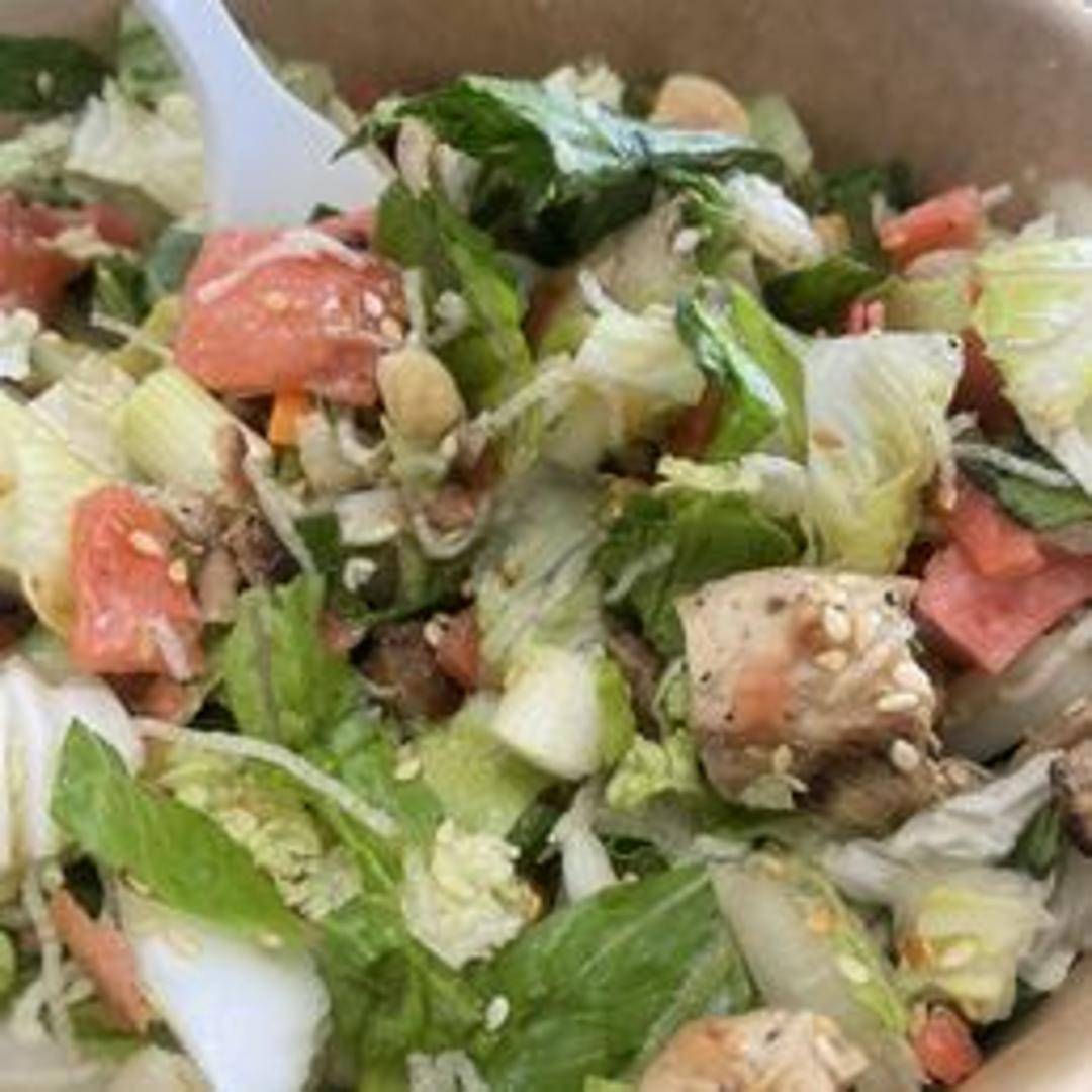Grilled chicken breast served atop a bed of romaine lettuce, tomatoes, cucumbers, red onion, Kalamata olives, feta cheese, and a light Greek vinaigrette.