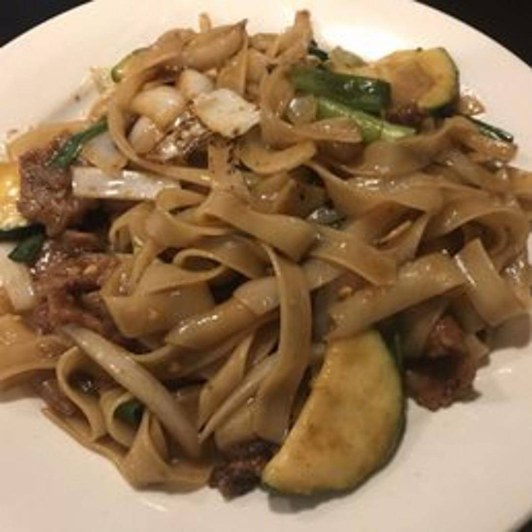 Wide, flat rice noodles stir-fried with tender slices of beef, bean sprouts, onions, and scallions in a savory soy sauce-based sauce.