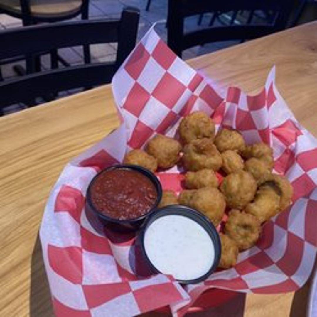 Crispy, golden-brown battered mushrooms served with a side of creamy ranch dressing for dipping.