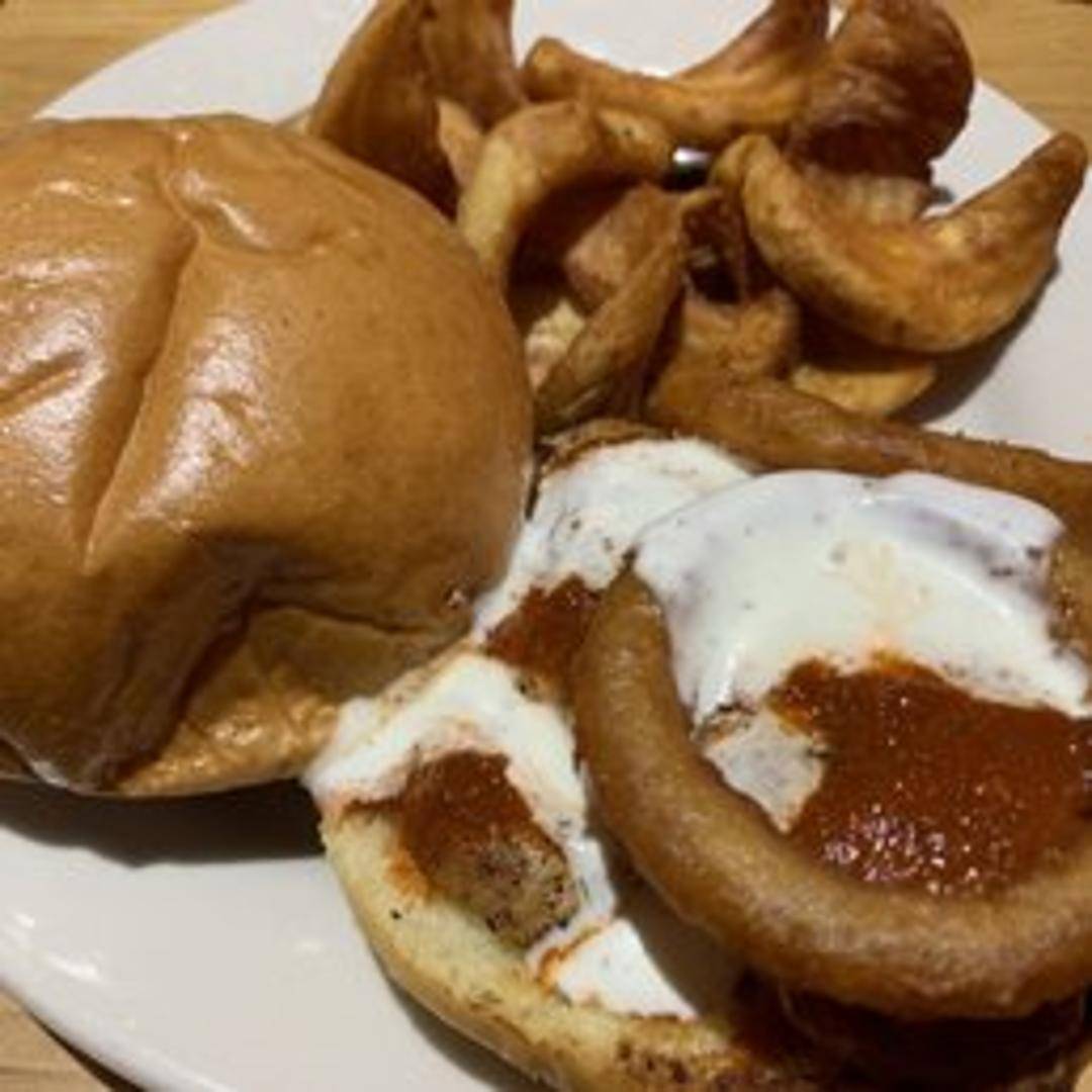A spicy, crispy fried chicken breast slathered in a fiery chili sauce, topped with coleslaw and pickles on a toasted bun. Prepare for some heat! Served with your choice of side.