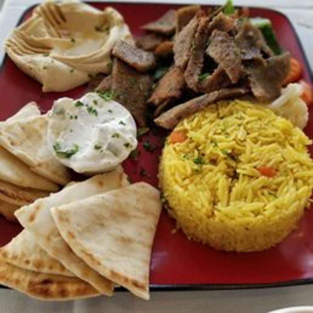 Thinly sliced gyro meat, served with rice, salad, and your choice of sauce.