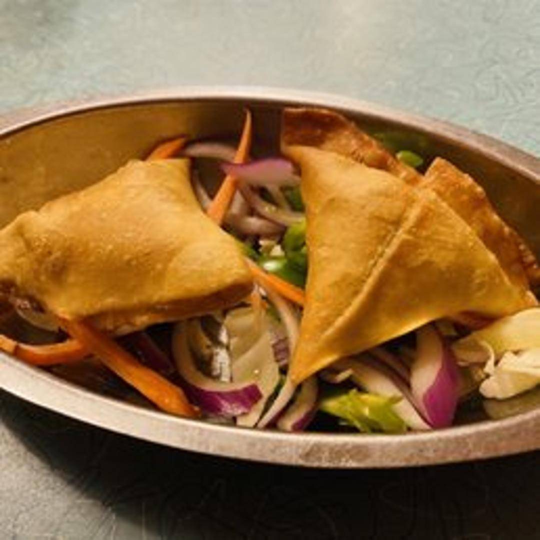 Crispy, triangular pastries filled with a savory mixture of potatoes, peas, and spices. Served with a side of chutney.