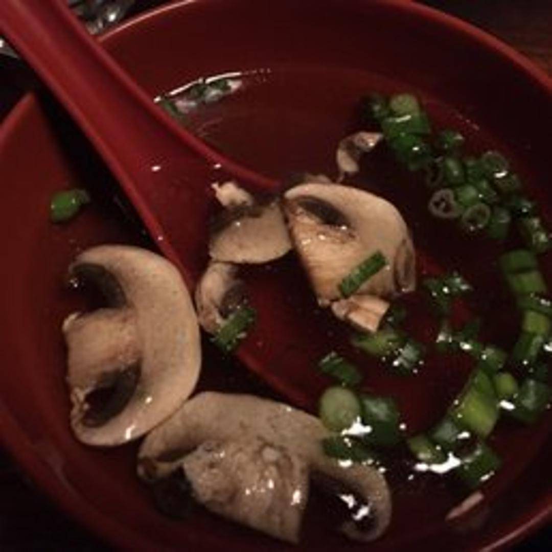 A light and comforting Japanese-style clear broth, served as a delicate appetizer. This elegant soup typically features a subtle dashi base, garnished simply with finely sliced mushrooms, tender scallions, and sometimes crispy fried onions, offering a warm and gentle start to any meal with its pure and clean flavors.