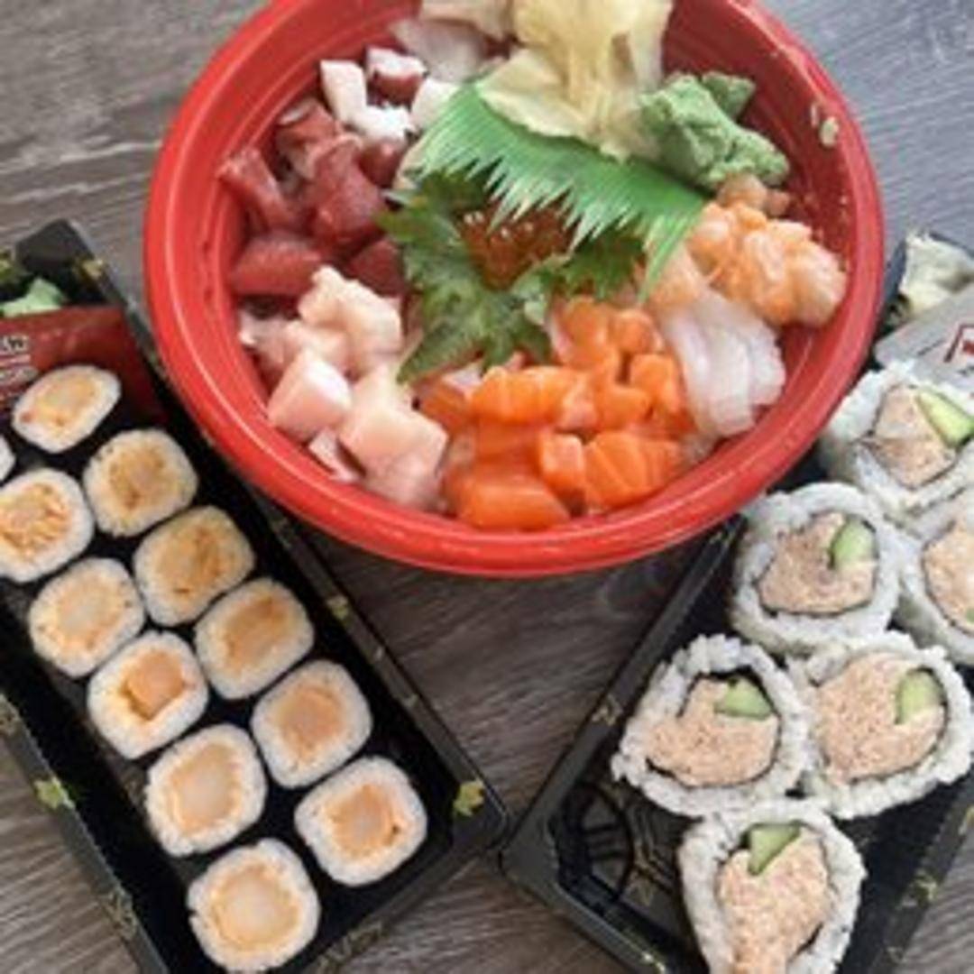 An assortment of fresh, premium seafood artfully arranged over a bed of seasoned sushi rice. Includes a variety of fish and other toppings.