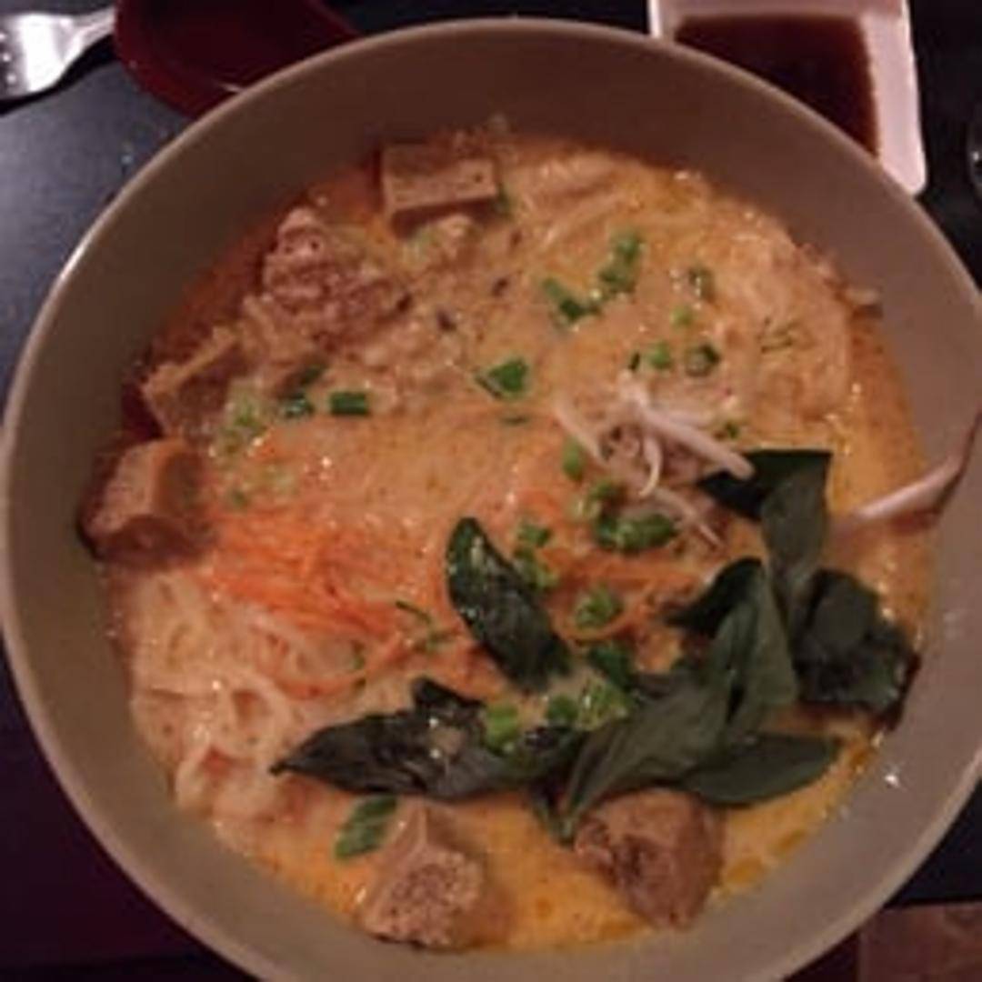 Stir-fried noodles with chicken, shrimp, or tofu in a creamy coconut sauce, tossed with vegetables.