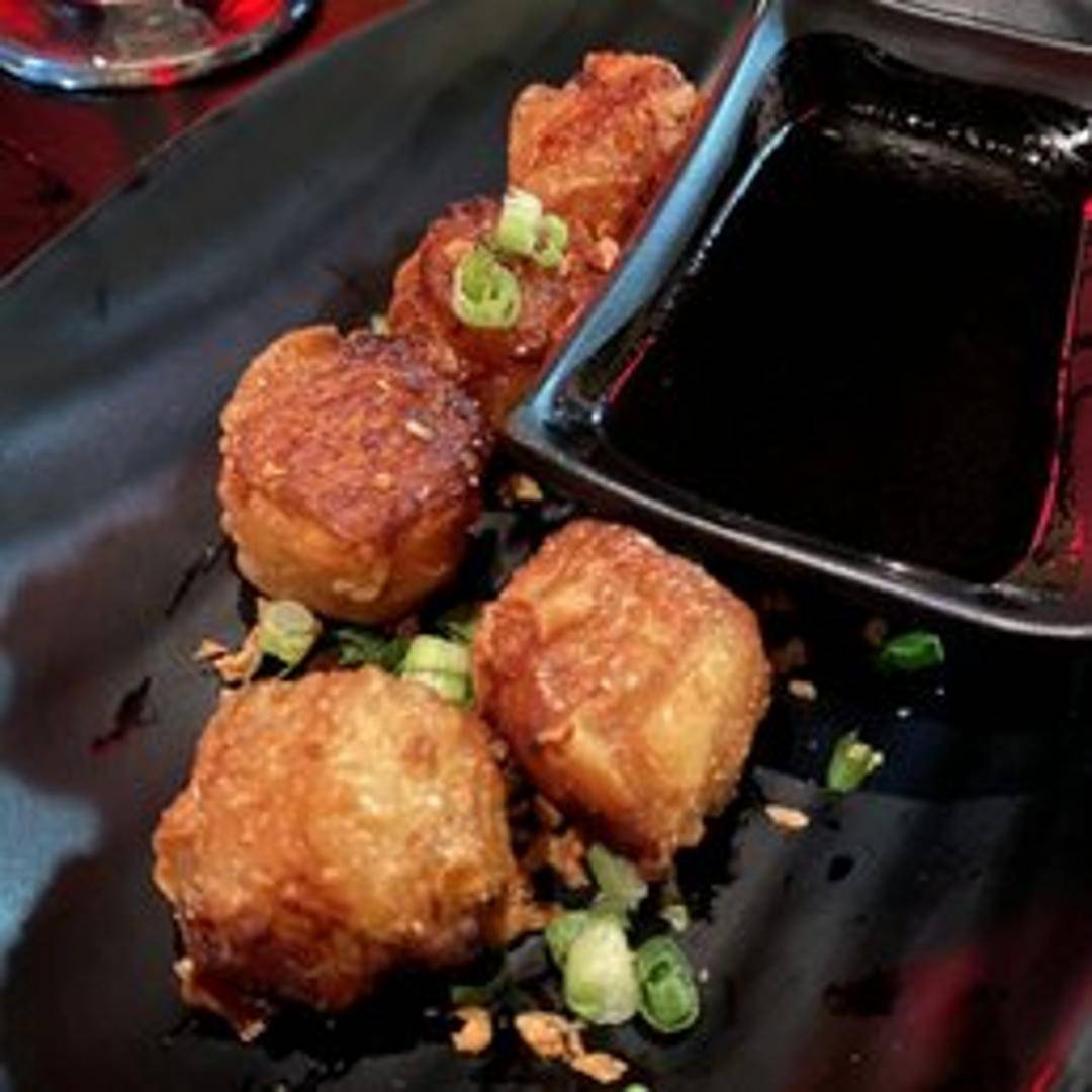 Pan-fried Japanese dumplings filled with a savory mixture of ground meat (typically pork), vegetables like cabbage and chives, garlic, ginger, and seasonings. Served with a dipping sauce, usually a combination of soy sauce, rice vinegar, and chili oil.