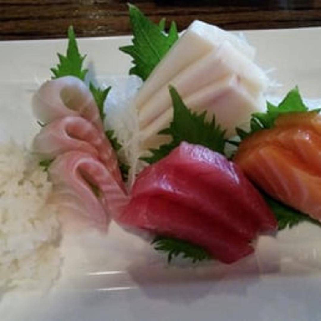 A selection of assorted fresh, raw fish fillets (chef's choice), typically including tuna, salmon, and white fish. Served with a side of rice, miso soup, and seaweed salad.