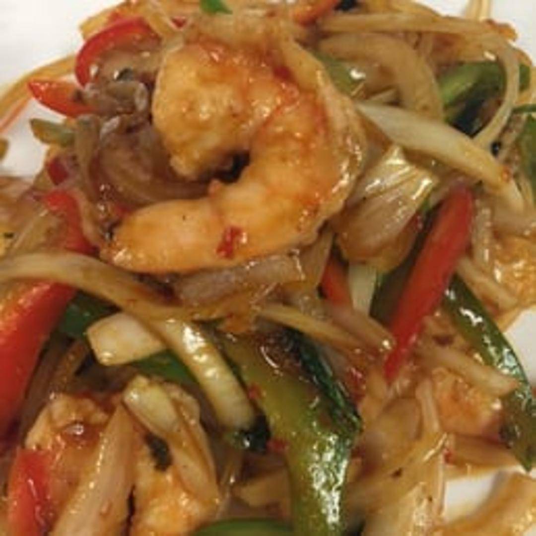 Sautéed shrimp stir-fried with fresh Thai basil, bell peppers, onions, and a flavorful sauce. Served with steamed rice.