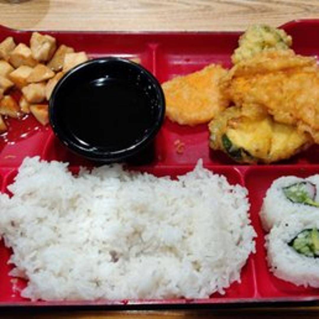 A complete and convenient Japanese meal featuring grilled or teriyaki chicken as the main component. The box typically includes rice, assorted tempura (vegetables and/or shrimp), California roll or other sushi, edamame, and pickled vegetables. May also include a small salad or fruit.