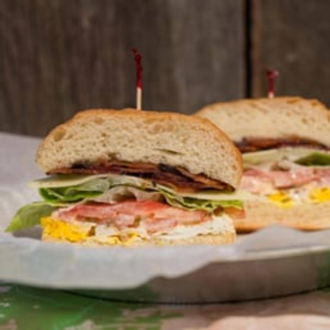 Egg, bacon, lettuce, tomato, and mayonnaise on toasted sourdough bread.